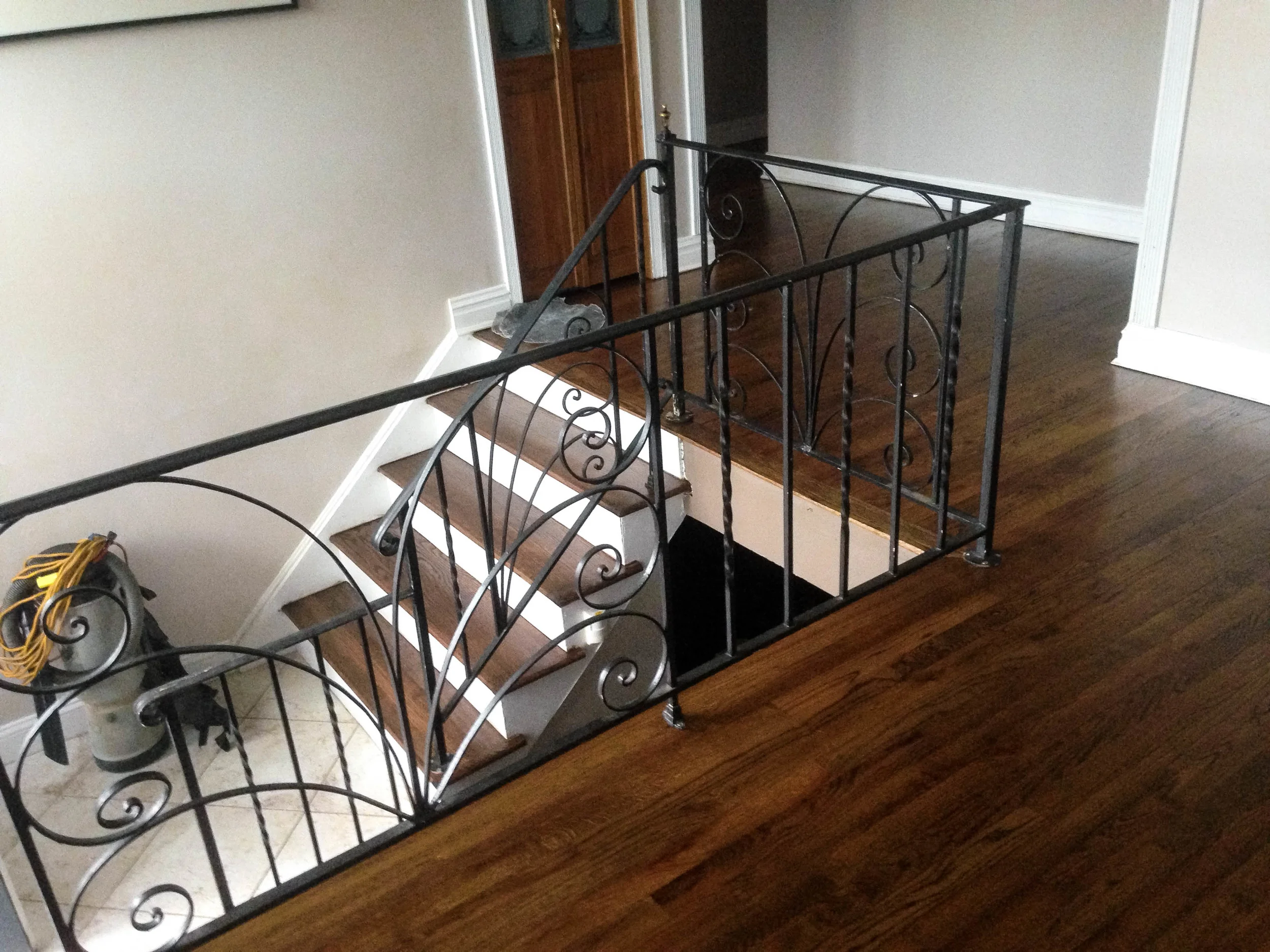 This set of floors and stairs on average takes up to 3 days. First, we sand the floors to remove any and all prior staining. And then we apply 1 coat of stain and 2 coats of finish. This process is done on separate days to ensure proper drying of the floors and to achieve the best results. If you're ready, try this color today!